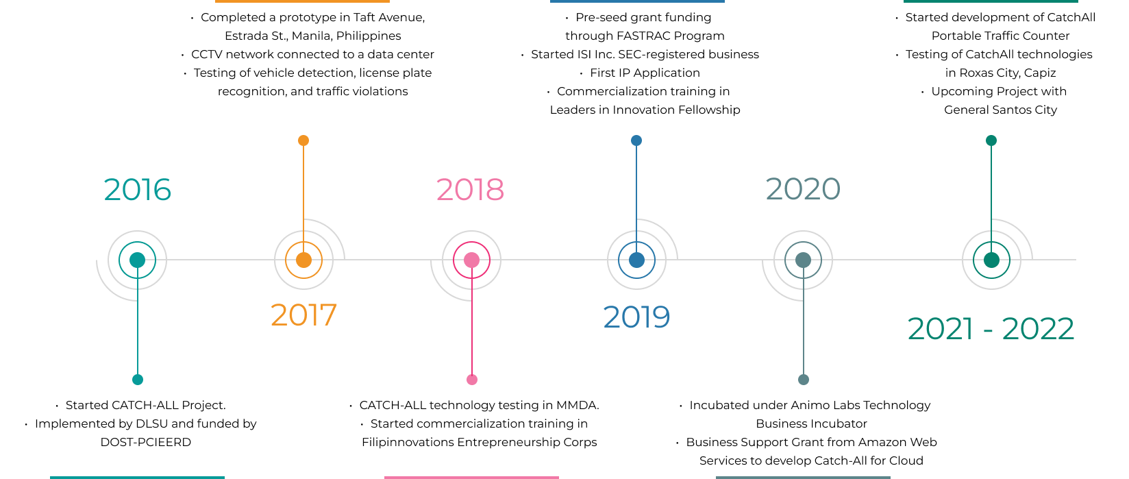 ISI Inc. is a spin-off company formed by the researchers of De La Salle University’s CATCH-ALL team. The CATCH-ALL project which started in January 2016 was a DOST-PCIEERD-funded project implemented by the researchers from Intelligent Systems Laboratory (ISL) of De La Salle University, Manila. The aim of the research project was to develop an automated non-contact traffic violations apprehension system which has the capability for automated detection up to traffic ticket generation. It used a CCTV-based network that have AI-based video processing and analytics capabilities to detect, track, and classify passing vehicles together with its license plate numbers. The pilot system was demonstrated in Taft Ave. and Estrada St. junction in July 2017.